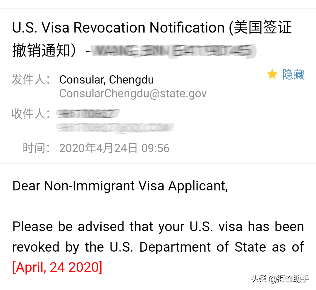 1.美国使领馆邮件通知签证被撤销 (Visa revoked