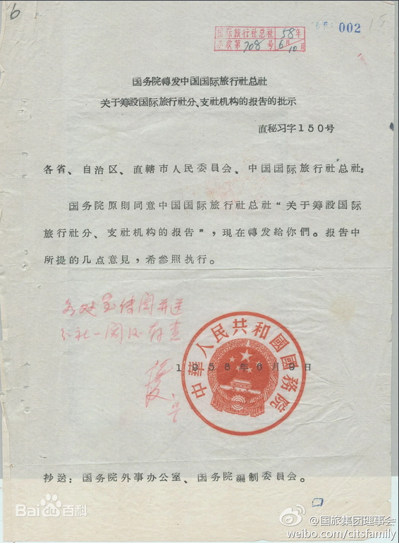 1958年6月,国务院下发中国国际旅行社总社关于筹设国际旅行社分、支社机构的报告的批示